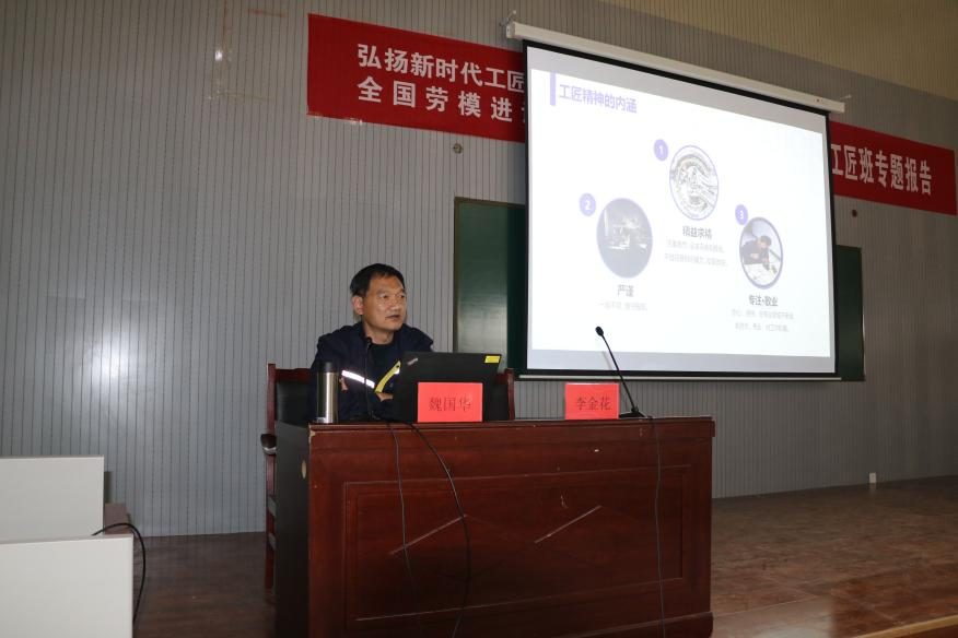 为贯彻落实《国家职业教育改革实施方案》,学习大国工匠精神,创新创业领军人才,培养并传承工匠精神,冰球官网MG冰球突破官网网站特邀全国劳模魏国华先生,于2021年3月25日在6号教学楼108室为师生开展了一场以“弘扬新时代工匠精神”为主题的报告会。参加会议人员有MG冰球突破官网网站院长安丰金、副院长李金花,以及部分老师代表学生代表等200余人参加了此次报告会,报告会由副院长李金花主持。